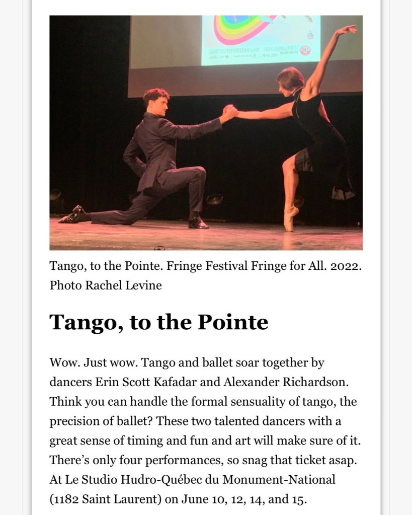 “Every time we perform, a pointe shoe dies,” say Erin Scott-Kafadar and Alexander Richardson, the artists from PointeTango. Both received their ballet education in Montreal. After two years of Covid restrictions, Scott-Kafadar and Richardson are ready to take back the stage with their performance piece “Tango, to the Pointe” at the Montreal Fringe Festival .